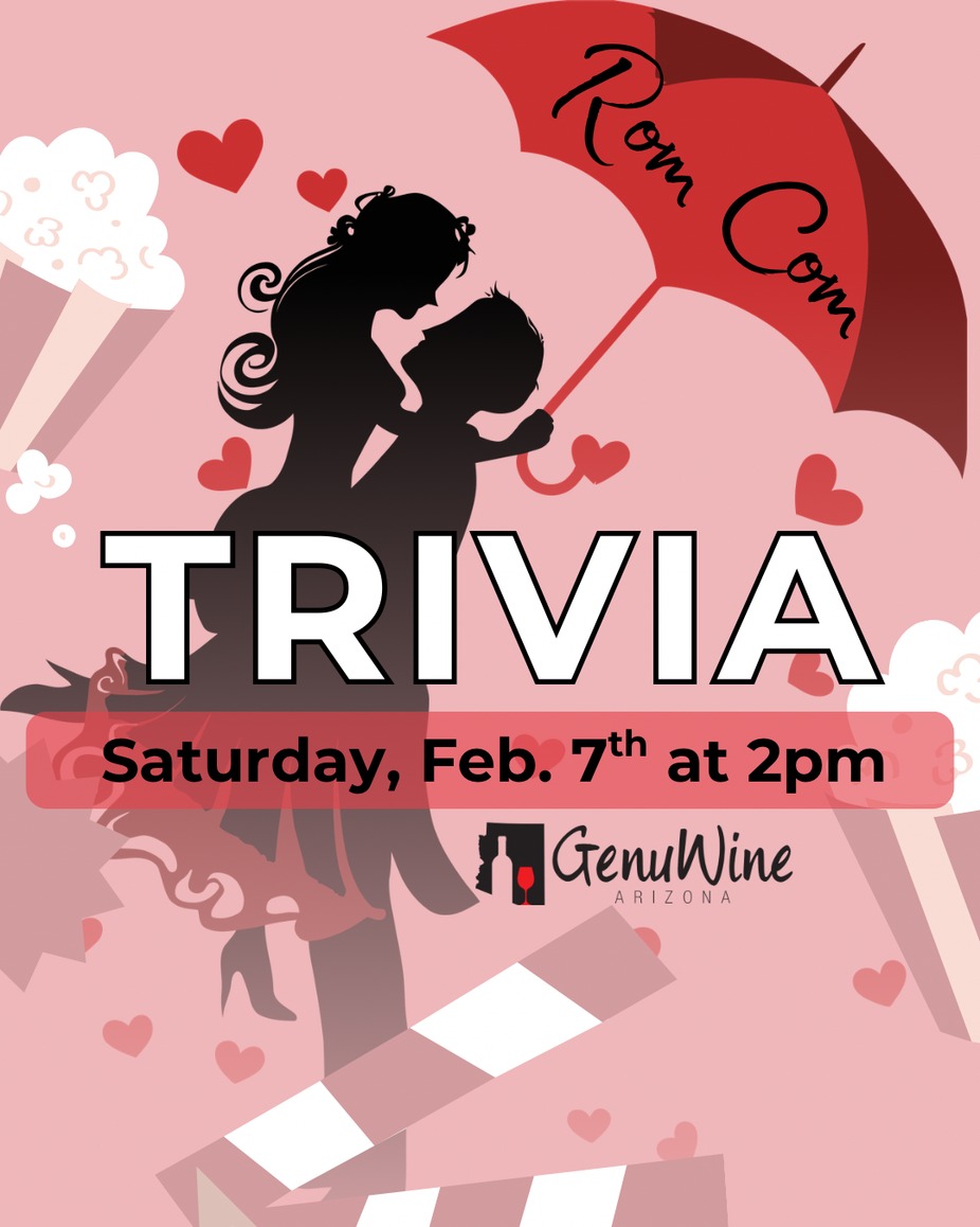 Fall head over heels for Rom Com Trivia at GenuWine 💕🍷 Join us Friday, Feb. 7 at 2pm for an afternoon of laughs, love, and your favorite romantic comedies—from meet-cutes to happily ever afters. Sip wine, grab a glass (or two), and test your rom-com knowledge for bragging rights and prizes. Perfect for a date, a Galentine’s outing, or flying solo like the main character you are. 🎬💖